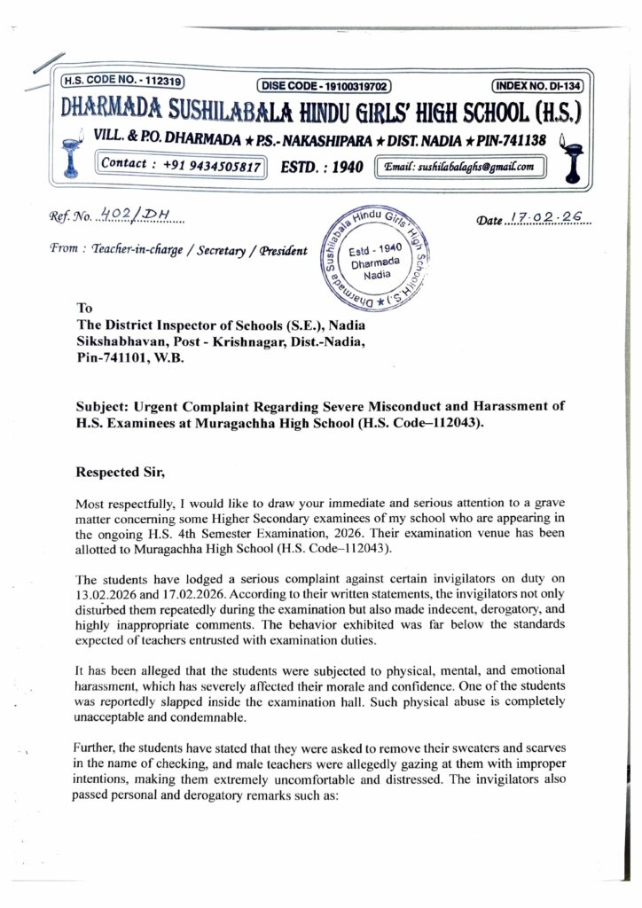 In an official complaint addressed to the District Inspector of Schools (D.I), Nadia, the Teacher-in-Charge of Dharmada Sushilabala Hindu Girls’ High School alleged that several invigilators at the examination venue engaged in inappropriate and objectionable behaviour on February 13 and 17, 2026.